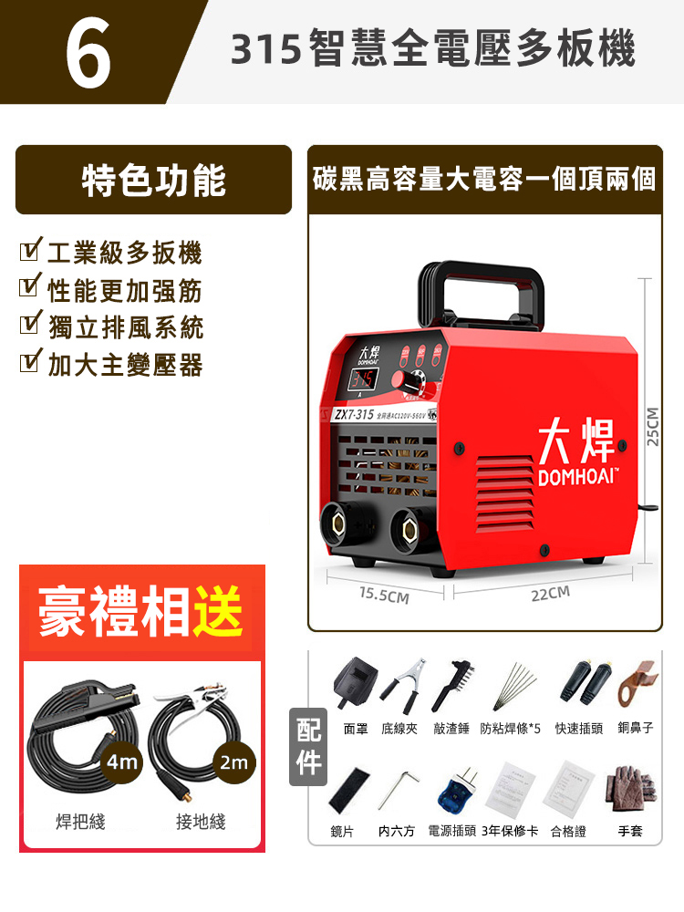20分鐘前業內焊機領軍品牌【德國DOMHOAI】全新二代數字化電焊機,瞬間起弧,長焊4.0焊條 - 【315-220V/380V】智慧全電壓多板機+2米接地線+4米焊把線+大禮包